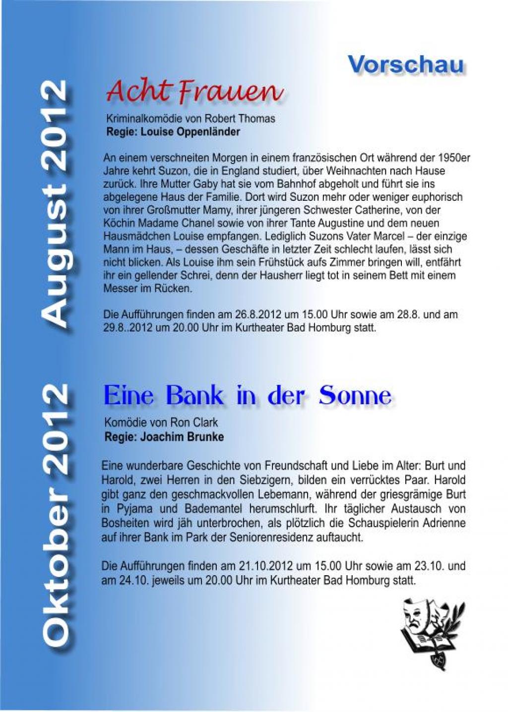 | Termine | 17.06.2012 - Kurtheater Bad Homburg 17.06.2012 - Kurtheater Bad Homburg 18.06.2012 - Kurtheater Bad Homburg |