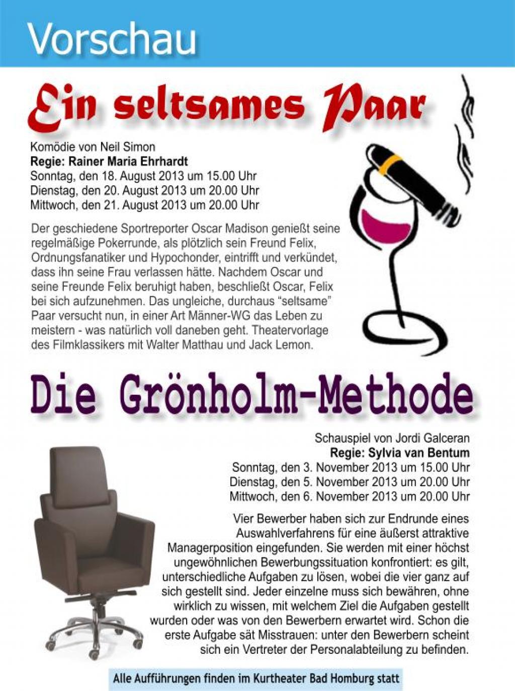 | Termine | 16.06.2013 - Kurtheater Bad Homburg 18.06.2013 - Kurtheater Bad Homburg 19.06.2013 - Kurtheater Bad Homburg |