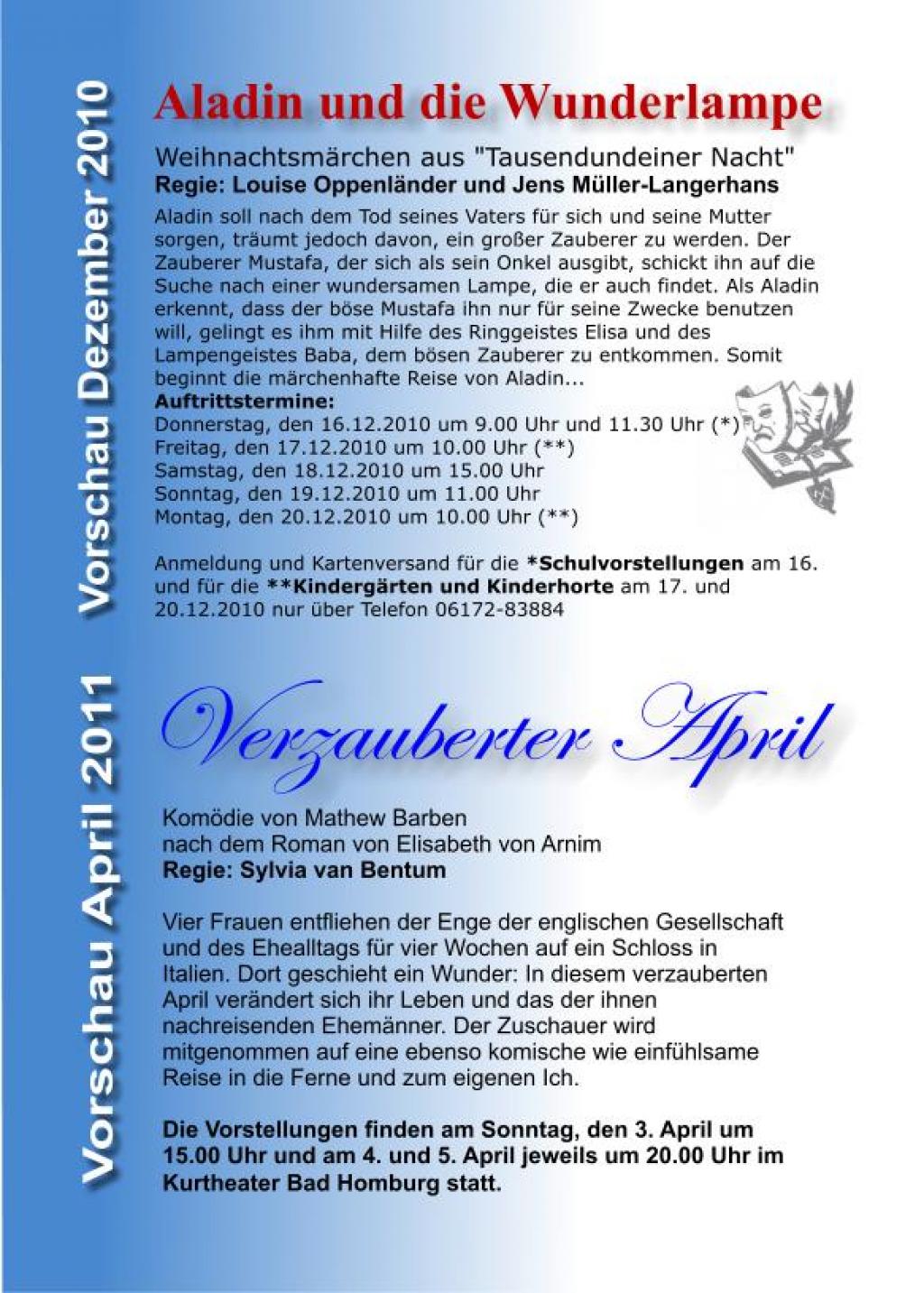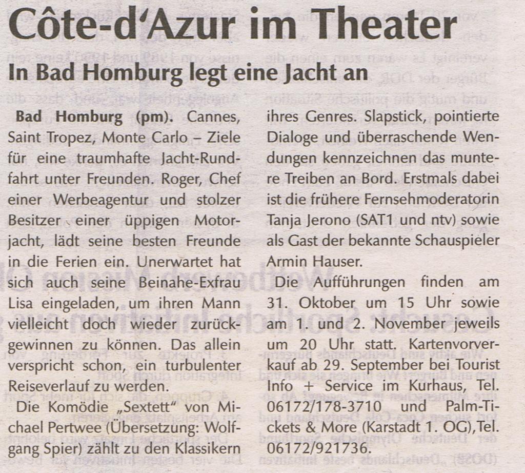 | Termine | 31.10.2010 - Kurtheater Bad Homburg 01.11.2010 - Kurtheater Bad Homburg 02.11.2010 - Kurtheater Bad Homburg |