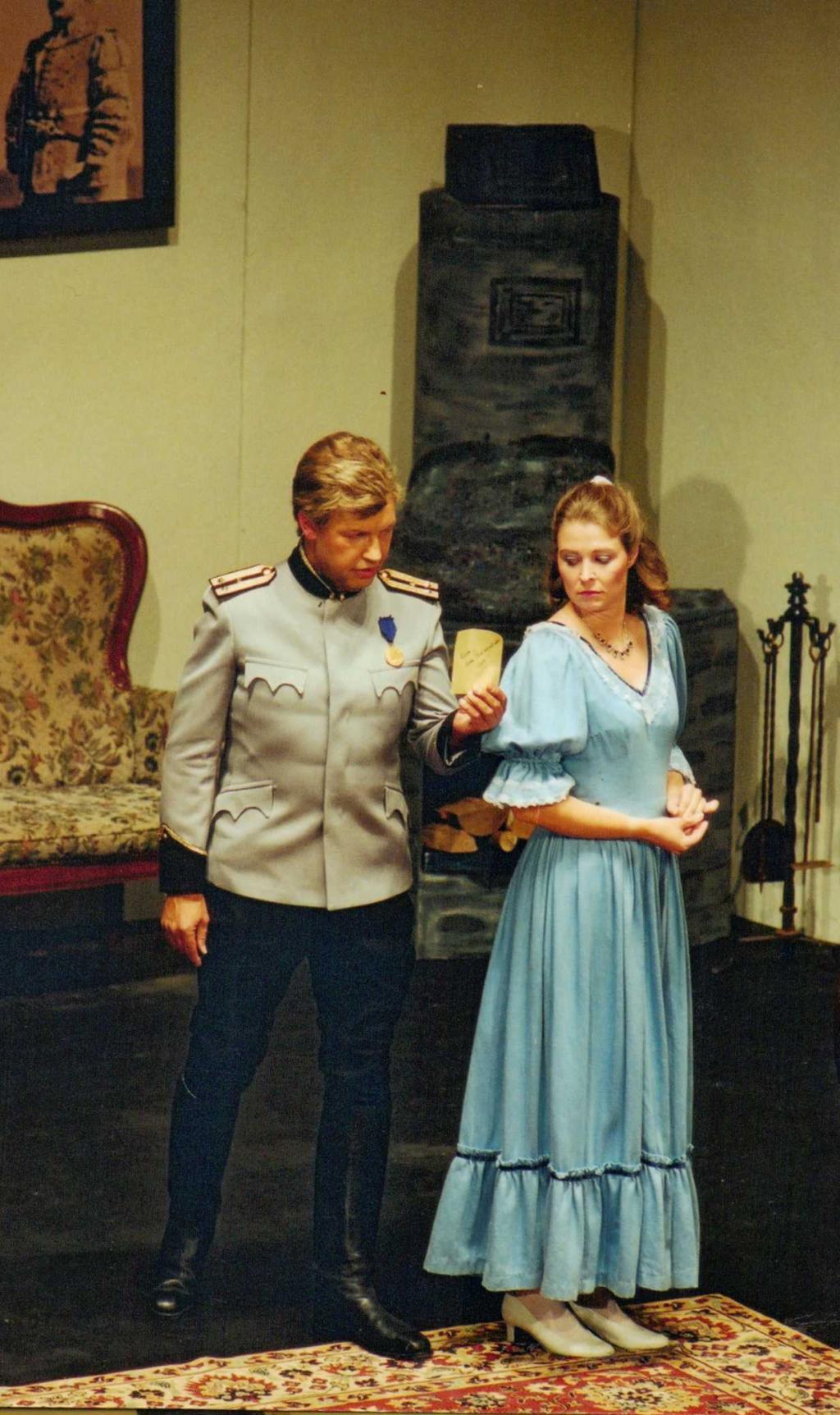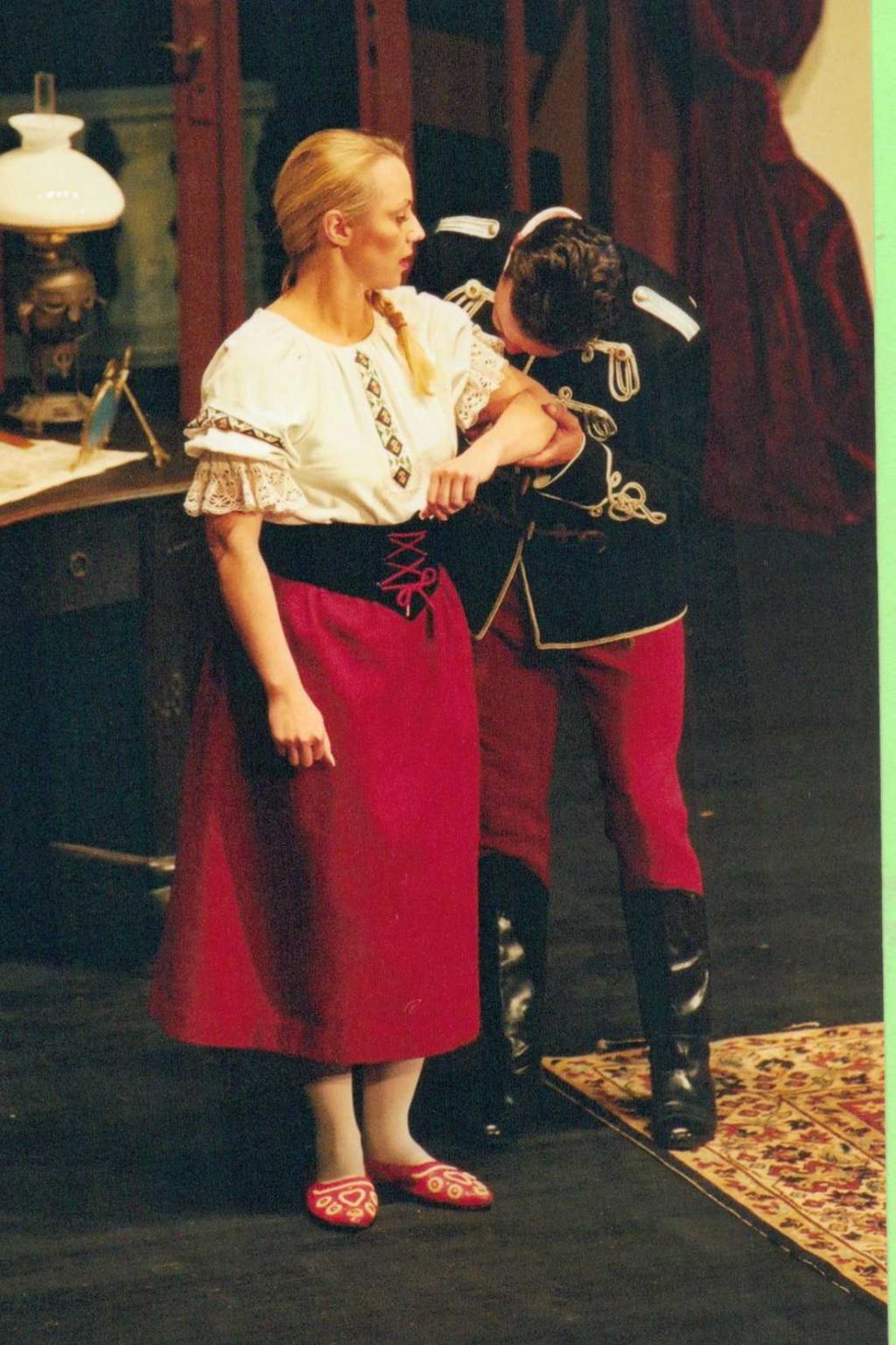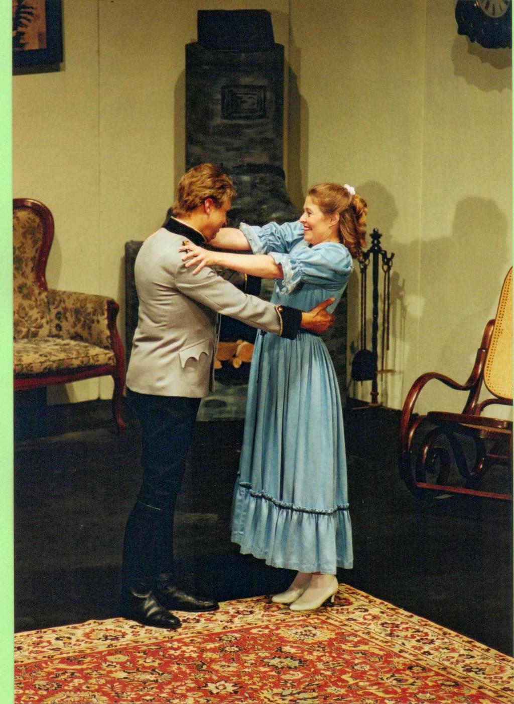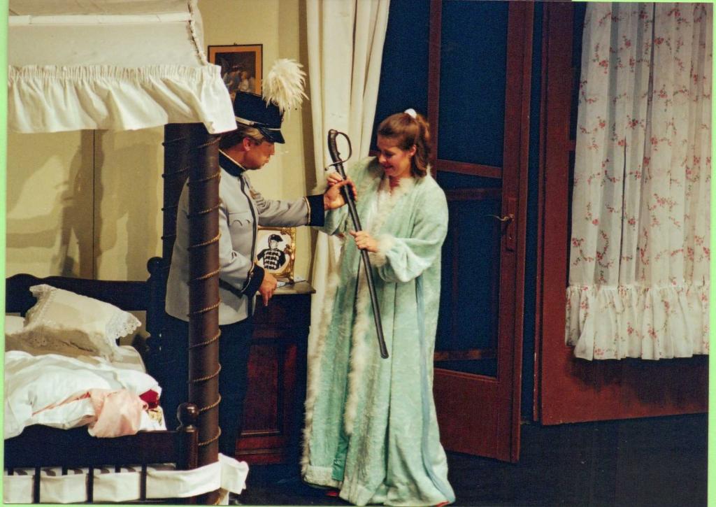 Die Flucht führt Hauptmann Bluntschli ausgerechnet in das Zimmer des bulgarischen Mädchens, das mit jenem “Helden” verlobt ist, der die Attacke gegen seine Artillerie-Batterie geritten hat. Zudem ist Raina, so heißt die junge Dame, Tochter eines bulgarischen Majors. Als die feindlichen Soldaten ihm dicht auf den Fersen sind, kann sich Bluntschli mit letzter Kraft am Balkon ihres Zimmers hochziehen. Drohend setzt er ihr den Revolver auf die Brust. Eine Drohung ist das freilich nicht, denn der Revolver ist nicht geladen; er braucht den Platz in seinen Taschen immer für ein bisschen Schokolade. So wird Bluntschli zum “Pralinee-Soldaten”. Wie nun die beiden Feinde so einige Zeit im Zimmer sind, und sie ihn genauer betrachtet, muss sie sich eingestehen, dass er eigentlich gar nicht so aussieht wie ein “Feind”, ja, er ihr sogar ein wenig sympathisch ist. Aber da ist noch etwas ... so ein ...prickelndes Gefühl....