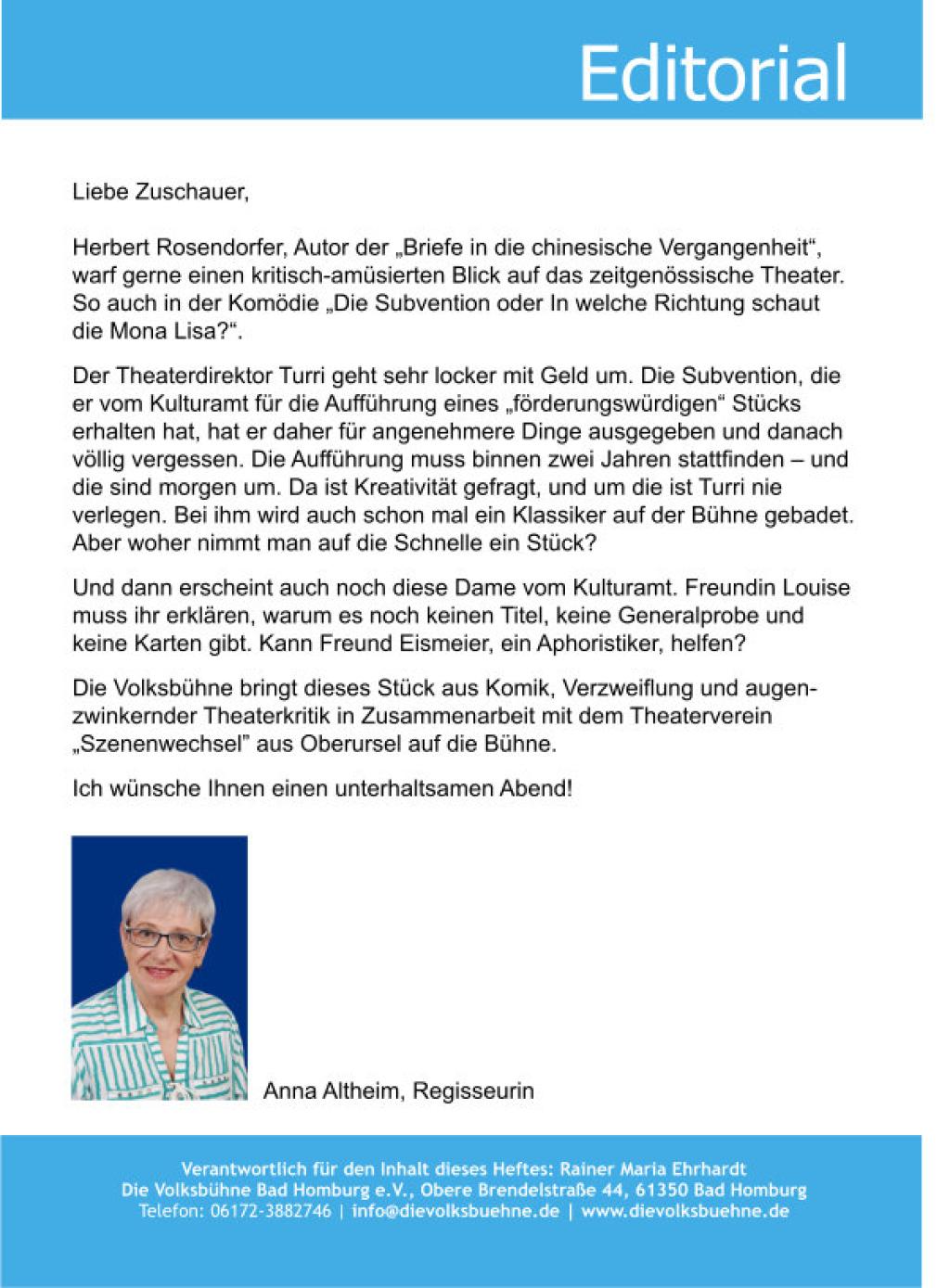 | Regieassistenz | Margit Altheim |